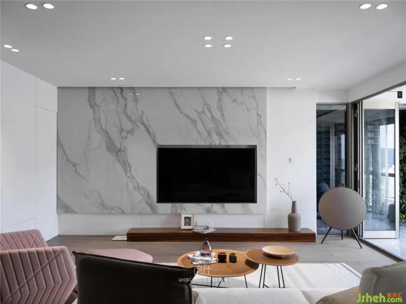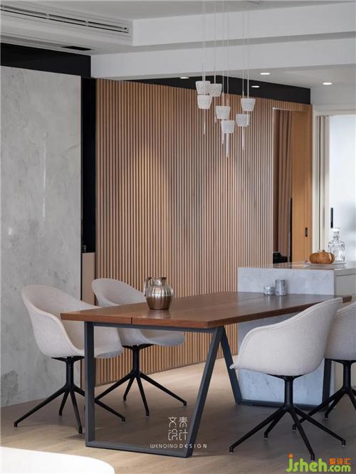 客廳臨近餐廳區(qū)域,有著一堵看似平平無(wú)奇的大白墻,這其實(shí)是通往公衛(wèi)的暗門(mén),為了隱形效果更出眾,我們特地將整面背景墻都用木作裝飾。