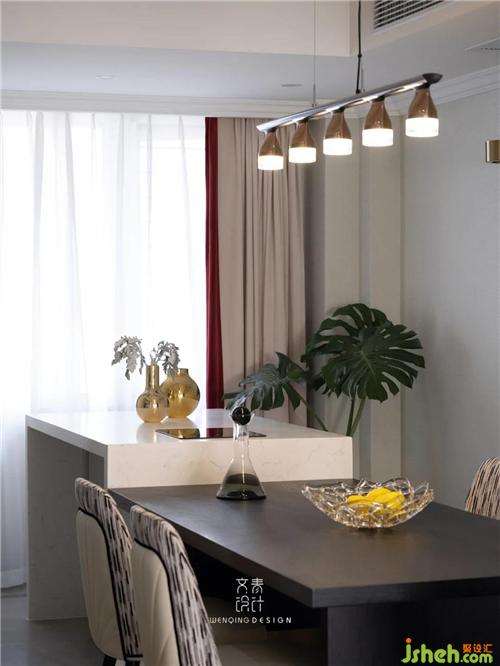 餐廳定制島臺外加一米八的大餐桌,輕松容納家中五口人同時用餐,島臺下面就是酒柜,充分提高空間使用率。島臺上的兩個小金瓶是瑞典的Skultuna Boule,餐桌的醒酒器是英國的Tom Dixon Tank,生活離不開精致的儀式感。