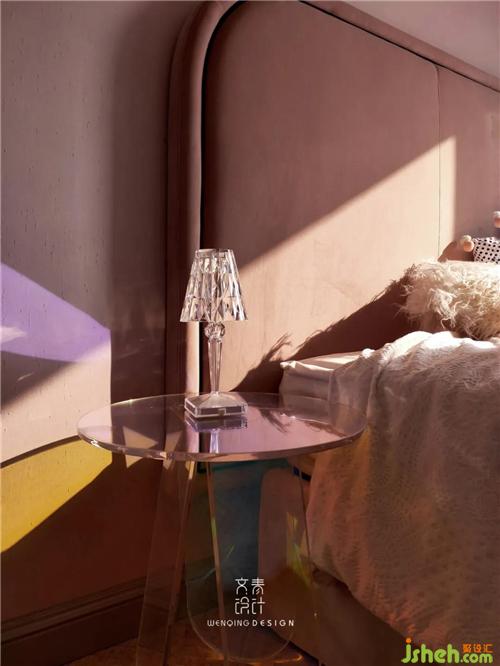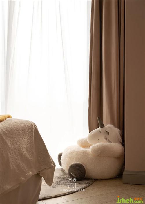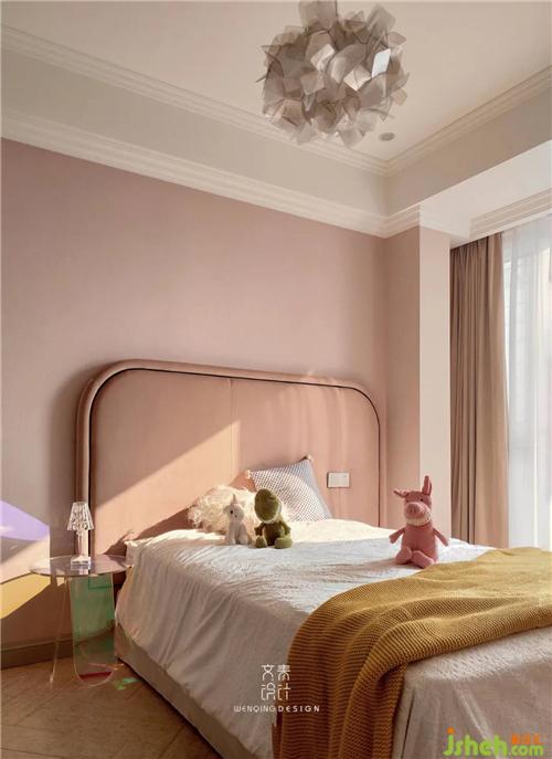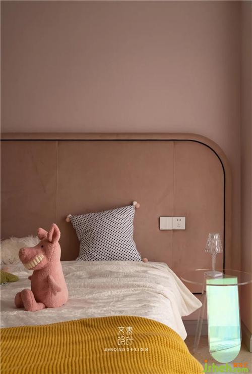 大女兒房是粉色公主房,定制的絲絨床靠背并沒有落地,而是直接和墻面固定,充分考慮后期衛(wèi)生的打理,杭州裝修設(shè)計窗邊的獨角獸懶人沙發(fā),可以供女兒閑暇時坐在窗邊看看書。