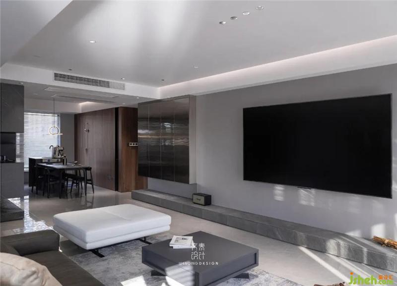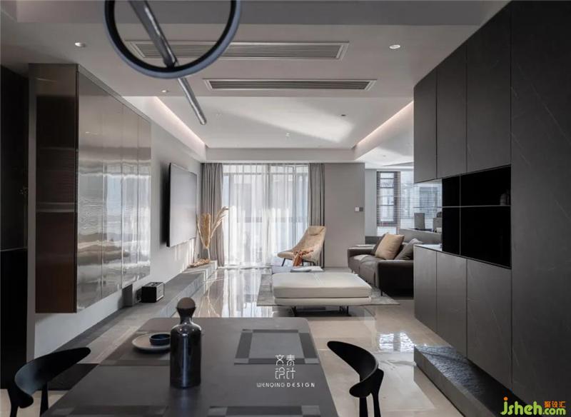 入戶鞋柜作為空間視覺(jué)轉(zhuǎn)折點(diǎn),讓空間之間的過(guò)渡更柔和??紤]到餐廳的采光,運(yùn)用百葉簾對(duì)光線的折射,營(yíng)造光學(xué)美感。