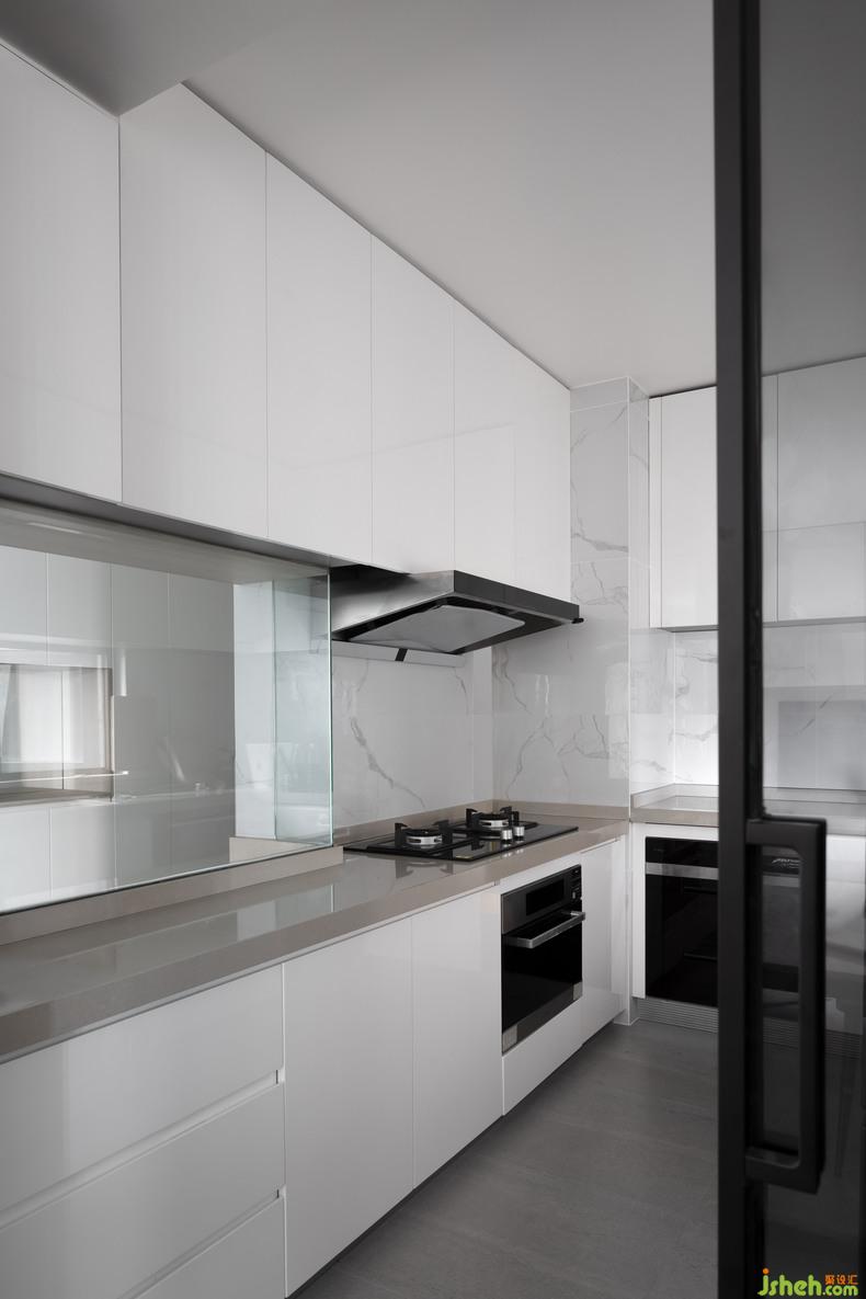 In order to brighten the kitchen during the day, the designer deliberately chose a glass door. The light flows in from the balcony of the living room, lighting up the space and people's mood. The transparent partition door not only prevents cooking fumes from invading other spaces, and facilitates daily cleaning, but also ensures that when working in the kitchen, you can see friends and family members who are talking and playing in the dining room or living room. While completing the visual natural transition and continuity, it enriches the interaction between people and space.