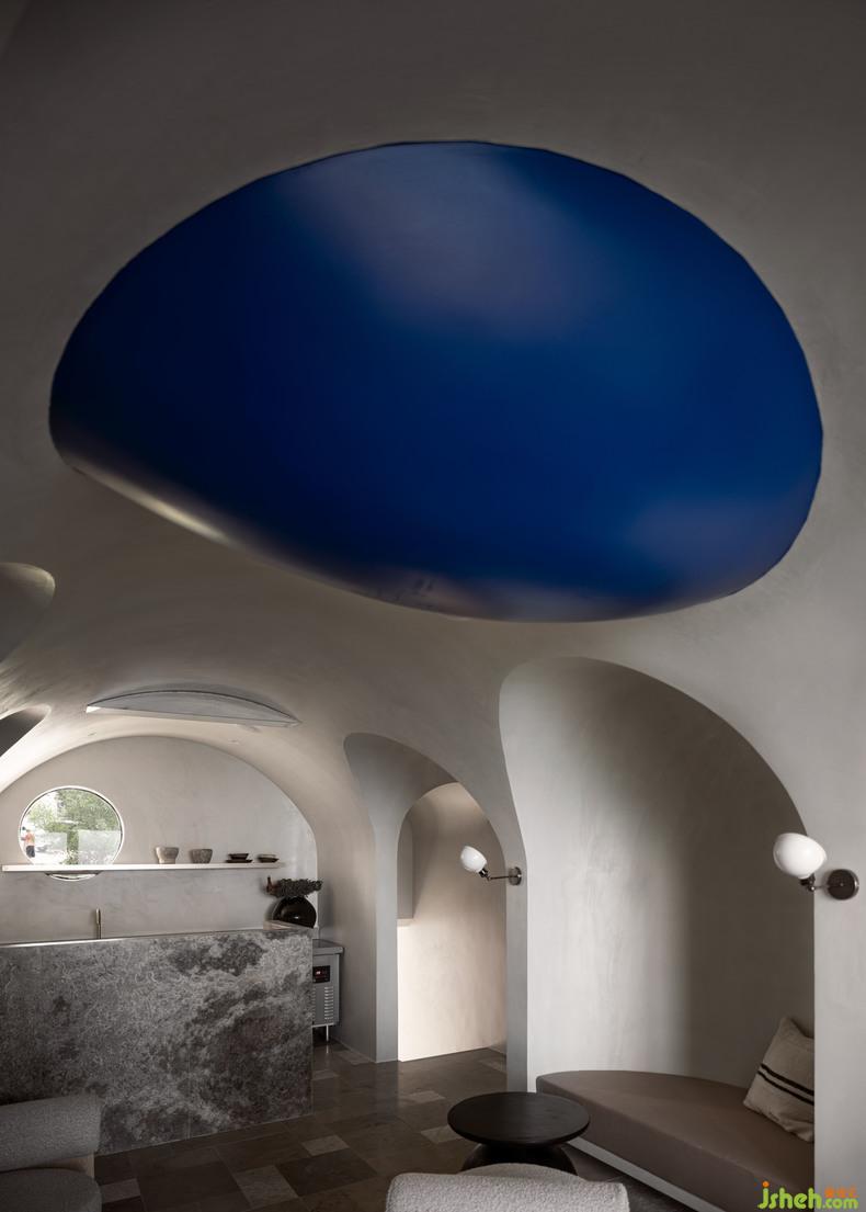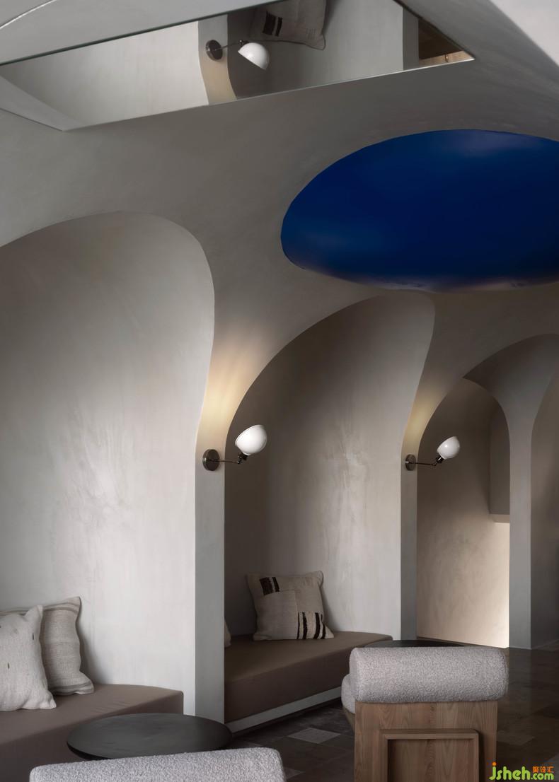 與餐廳方位正相反,咖啡廳位于接待區(qū)之上。不同于餐廳整體的素雅,咖啡廳在以白色為主題的背景中,注入了一抹生動的克萊因藍(lán),從沉靜克制的感覺中跳脫出來,彌散開不一樣的氛圍感。
