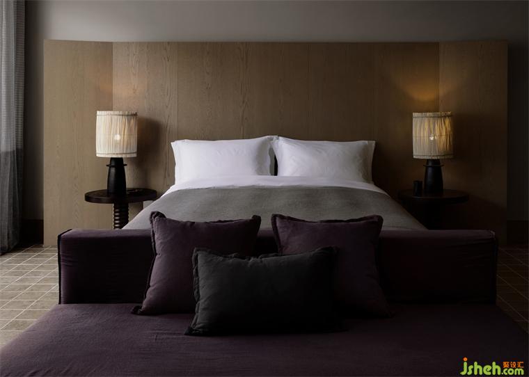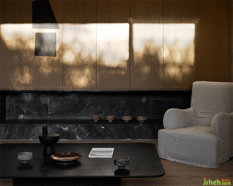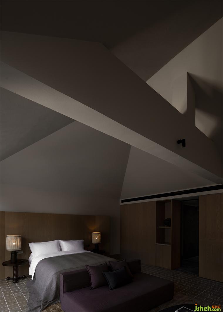 室內(nèi)規(guī)劃隨著空間的轉(zhuǎn)移,產(chǎn)生了動(dòng)態(tài)的變化。原本平鋪的天花在此處向上抬升,深圳民宿設(shè)計(jì)將柱體的原始形態(tài)自然袒露。穿插于線條之中,構(gòu)筑出不規(guī)則的幾何美感。