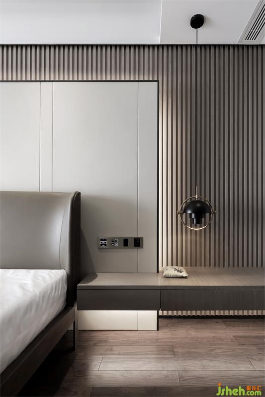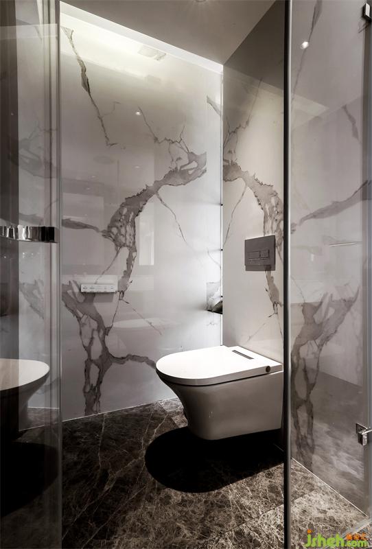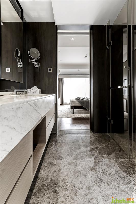 家居設(shè)計(jì)隔斷主浴室和衣帽間的是整面全通透的淺灰玻璃,衣帽間不會(huì)被主浴室的濕氣影響,主浴室也能納入衣帽間的光亮,既是兩個(gè)獨(dú)立區(qū)域,又是一個(gè)整體的視覺空間。