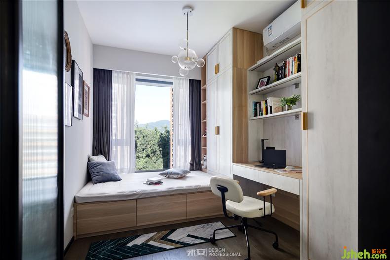 書房以白色、原木色為主色調(diào),黃銅框線裝飾的柜面,雅致中又自然地流露出主人的品味。在下午的悠閑時(shí)光里,憑窗翻卷,窗外是遠(yuǎn)方,窗內(nèi)是心靈,心目間常要一塵不染