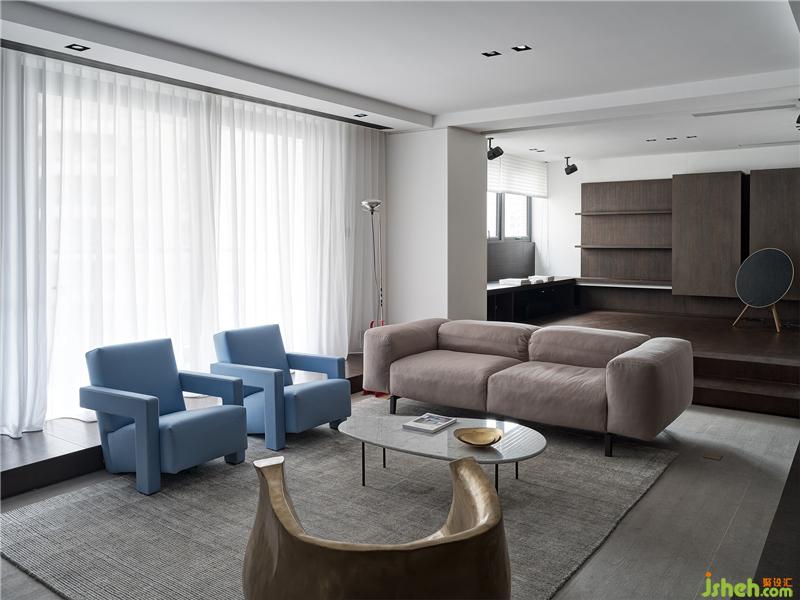 空間打破原本局促的格局,從入口處開始規(guī)劃出一條干凈利落的空間動線。以地臺高低的變化將客餐區(qū)一分為二,客廳利用四周靈活可抽動的踏板臺階為界,同時回型合式踏板塑造出空間的體塊感。