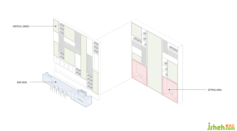 以綠色明快的墻面分割設(shè)計(jì)媒介,垂直的綠色生態(tài)隔斷憑欄處俯視空間的構(gòu)成穿插。延伸了空間層次通透感,讓空間的存在穿透和時(shí)間的界線(xiàn)。