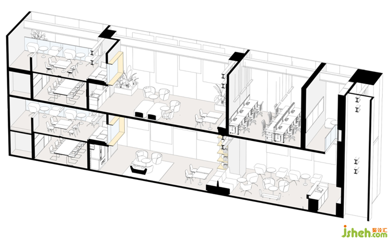 空間中的一抹黃色點(diǎn)綴,融合簡(jiǎn)潔的線(xiàn)條符合現(xiàn)代年輕群體的辦公審美??臻g與家具之間的相互搭配,滿(mǎn)足空間多元化的功能需求。就像蒙德里安色彩構(gòu)成的幾何體塊感,模糊了空間界面,促進(jìn)情感交流、思想碰撞。促進(jìn)職業(yè)社交的多元新型辦公文化。辦公室設(shè)計(jì)
