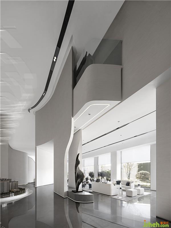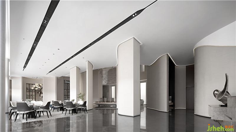 接待前廳,幾段曲線,寥寥幾筆繪盡漢水迸流的寫意之美,意象與自然并肩偕行。深厚的人文與線條的靈動(dòng)如浪濤般綿延,素雅無(wú)邊卻又風(fēng)雅自成。