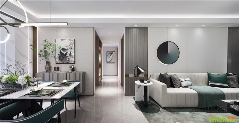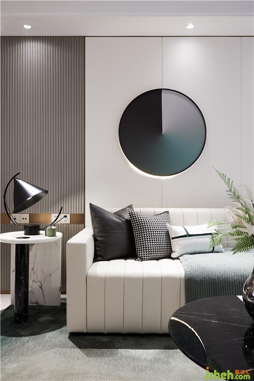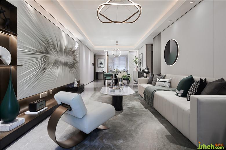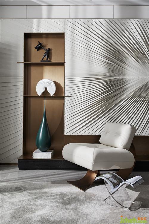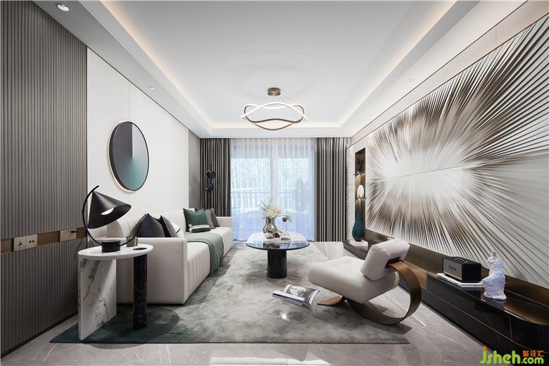 極為利落的肌理在客廳的背景墻上舒張蔓延,雨滴落下,樣板房裝修設(shè)計仿若無聲的空間沾染上生命的悅動,帶著巨大的張力,涌動著鮮活的生命氣息。