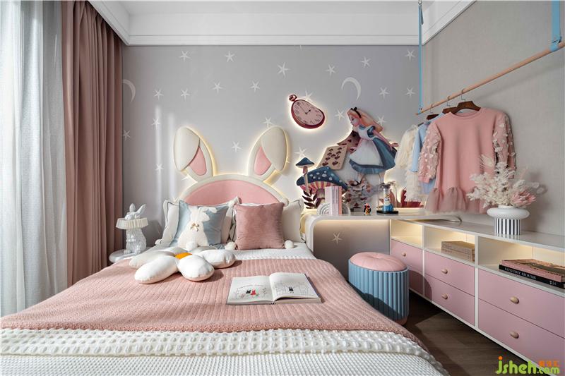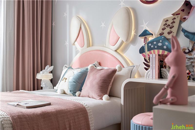 女孩房以愛麗絲荒誕又美好的故事為靈感,創(chuàng)造出天馬行空的兒童夢境??蓯厶煺娴男⊥米哟┧笃渲?,愛麗絲立體書屋,撲克牌紅衛(wèi)兵等趣味元素闖入眼簾,童話的鑰匙,打開了奇妙的微小世界。