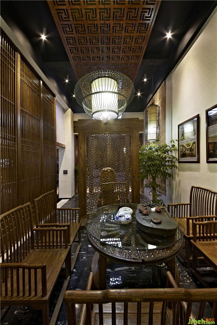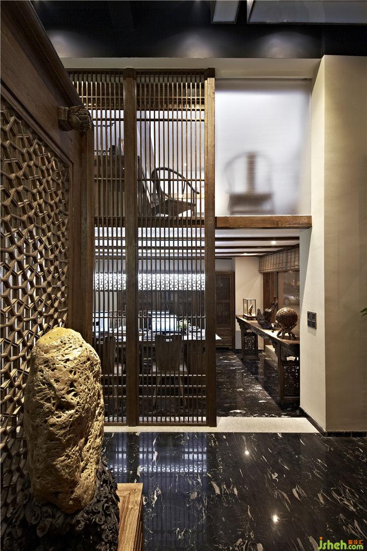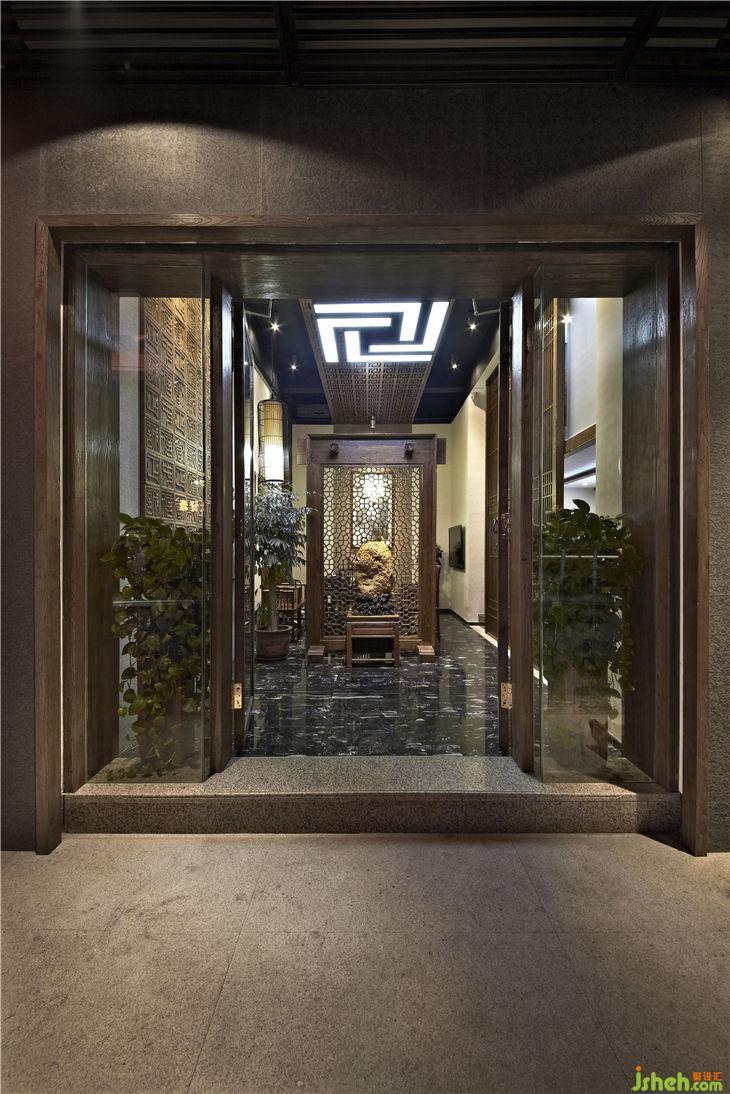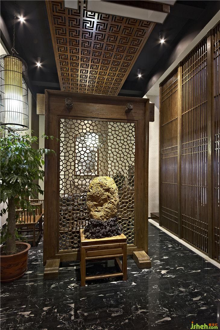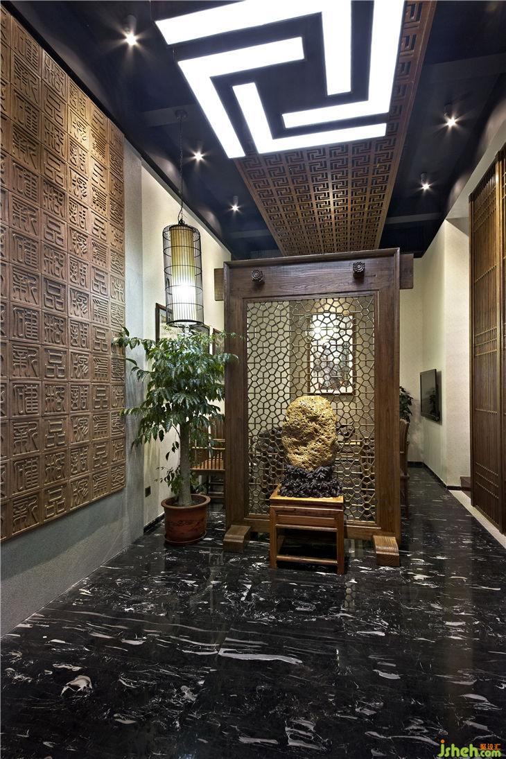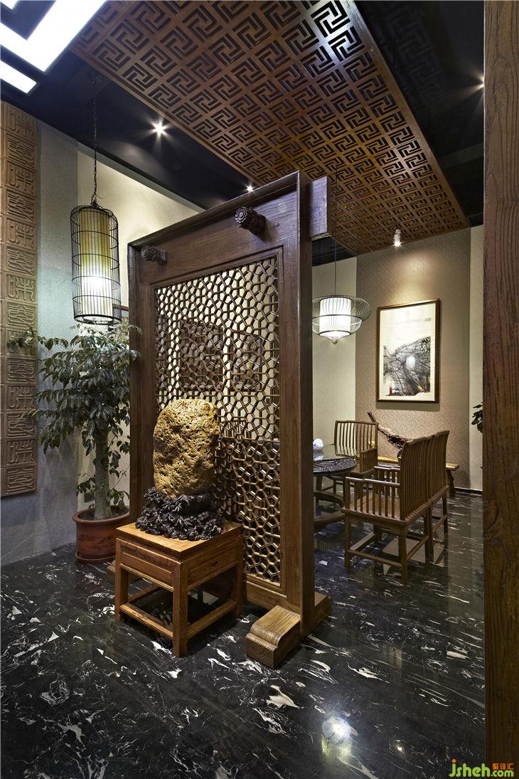 不同功能區(qū)之間以落地榆木直條窗欞做隔斷,不僅渲染出一種東方文化的文人風(fēng)范的古韻美,同時(shí)也體現(xiàn)現(xiàn)代設(shè)計(jì)上“似透非透”的視覺效果和“意到筆不到”的書法韻味;暖暖的陽光透過鏤空圖案的榆木屏風(fēng),益顯風(fēng)搖疏影動(dòng),給人一種心靈安逸與心境的閑靜。用正格設(shè)計(jì)標(biāo)志的圖形重復(fù)構(gòu)成鏤空雕刻的榆木板,懸掛在黑色的天花上,貫穿門廳與接待區(qū),溫馨傳遞著企業(yè)文化與精神,傳統(tǒng)樸素的語言在現(xiàn)代的空間中悄悄的融合、互相滲透,賦予整個(gè)空間的和諧情調(diào)。