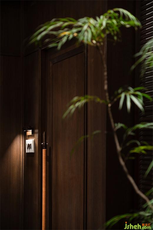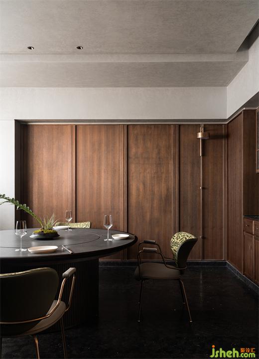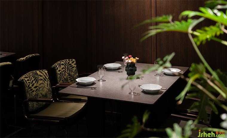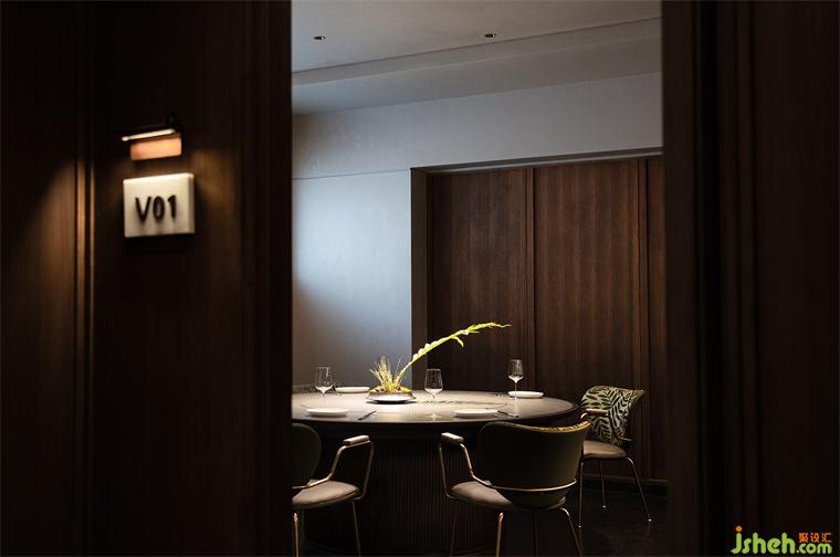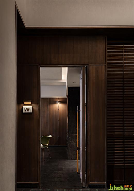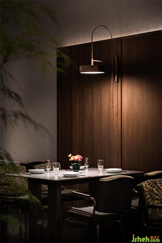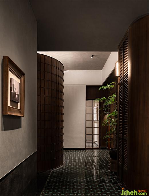 沿花磚廊道至包房區(qū),木飾面包覆的半圓結(jié)構(gòu)柱陡然打破平直的空間,婉轉(zhuǎn)的流動性將客人吸引至更深處的空間?;疱佋O(shè)計空間曲率的一點變化像畫師腕力一轉(zhuǎn),畫中鳥獸隨即靈態(tài)必現(xiàn)。角線片段式地編織進天花結(jié)構(gòu),低調(diào)不失輕巧地致意古典。人們總對起伏跌宕的敘事著迷,空間亦如是,在變化的韻律里,煙火趣味生生不息。