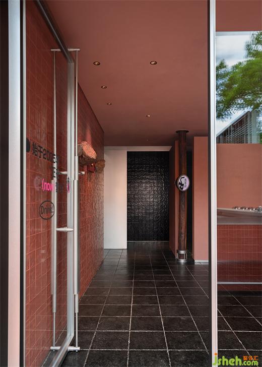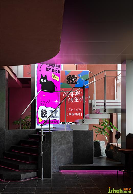 烤魚餐廳設(shè)計(jì)用鋼筋和玻璃做建筑骨架勾勒出橫豎兩個(gè)半開放的盒子,透過玻璃能看到簡(jiǎn)潔的扶梯組織起建筑動(dòng)線并從內(nèi)部連通兩個(gè)空間,同時(shí)將食客引向?qū)挸ǖ奈蓓斅杜_(tái)——簋街街景在那里盡收眼底。