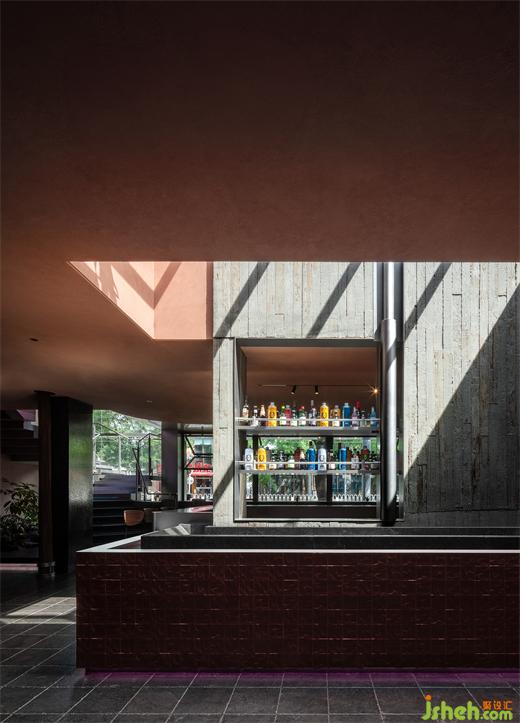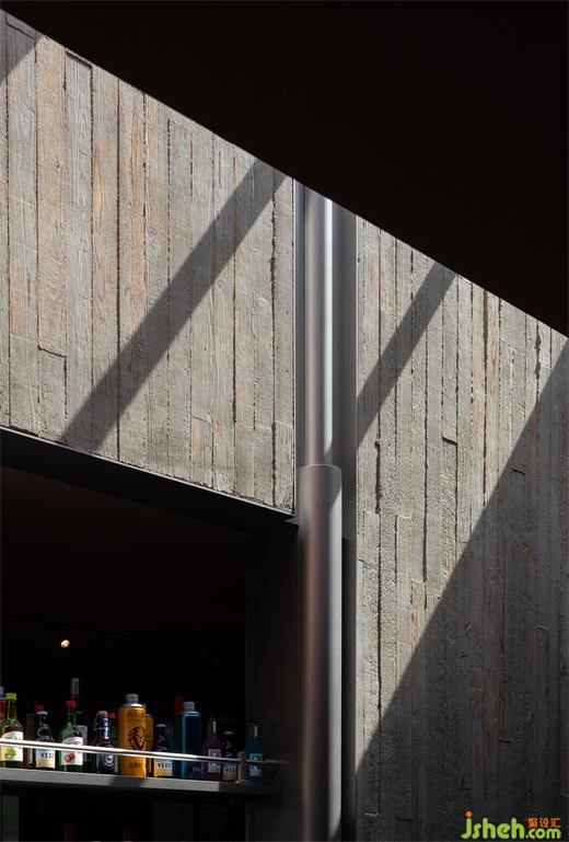 餐廳內(nèi)部在設(shè)計(jì)上與建筑保持著一致的呼吸感,除了靈魂般的二層露臺(tái),垂直方向上設(shè)計(jì)師在U型吧臺(tái)位置開矩形天窗,傾瀉而下的自然光縱貫空間,使中央吧臺(tái)兼具宴飲活力和自然韻律,流水、景觀、植物片段式穿插期間,散座區(qū)因此一掃沉悶。