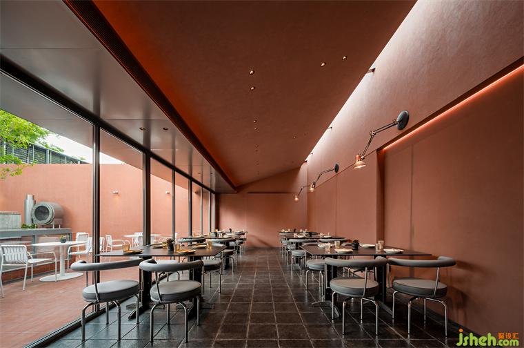 陶土色在立面大量使用,懷舊氣息和自然屬性使它成為不二之選,在二層露臺(tái),清爽的戶外家具及吧臺(tái)和它一起營造出阿拉伯沿海度假感,傍晚霓虹炫彩,不乏排隊(duì)只為登高小酌一杯的年輕人,烤魚這個(gè)看似式微的品類被包容性極大的空間體驗(yàn)巧妙化解。