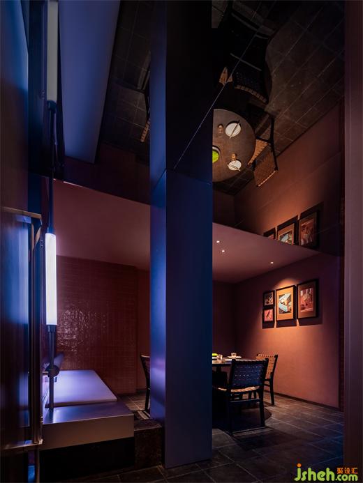 非露天區(qū)劃分為四間VIP包房,從下仰望,走廊屋頂打開圓形天窗,讓人聯(lián)想到太空艙飛離地球的瞬間灑下機(jī)械的冷光。