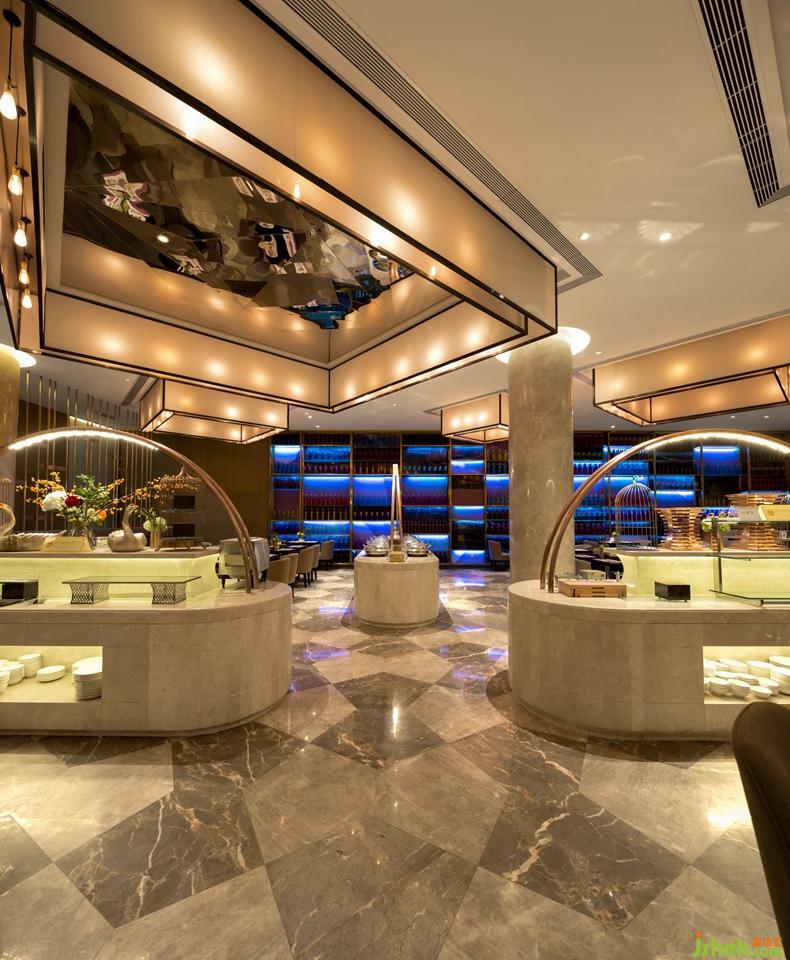 西餐廳最吸引人的是巨大燈具,采用兩層PC紗布夾燈光于中間使其燈光照明富有層次。用餐時避免燈光刺眼,讓人們覺得親切更舒服。同時,這種簡單的裝飾照明也能給顧客帶來一種寬敞感。餐廳的擺放美食臺以菜籃的樣式呈現(xiàn),就像一個海濱姑娘做的美食供大家享用,挑喜歡的食物。把客人帶入溫馨、浪漫與舒適的環(huán)境。