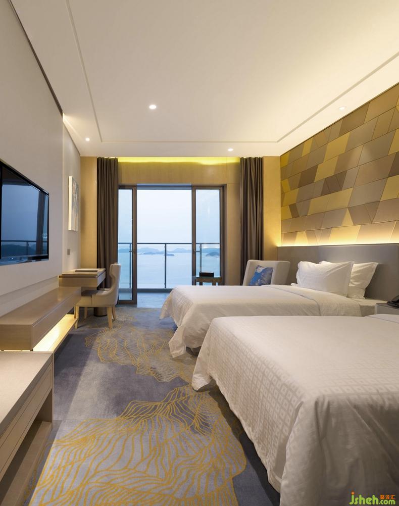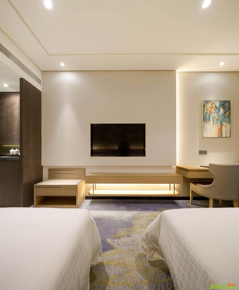 客房地毯顏色與大海融合一體,添加不同的藝術(shù)紋路且又具有代表性,根據(jù)每個不同代表性房間的設(shè)計,使整個空間布局規(guī)整。床的背景墻使用色塊表現(xiàn)年輕態(tài)的思維邏輯有創(chuàng)想,且清晰明朗,呈現(xiàn)一種潛力無限的狀態(tài)