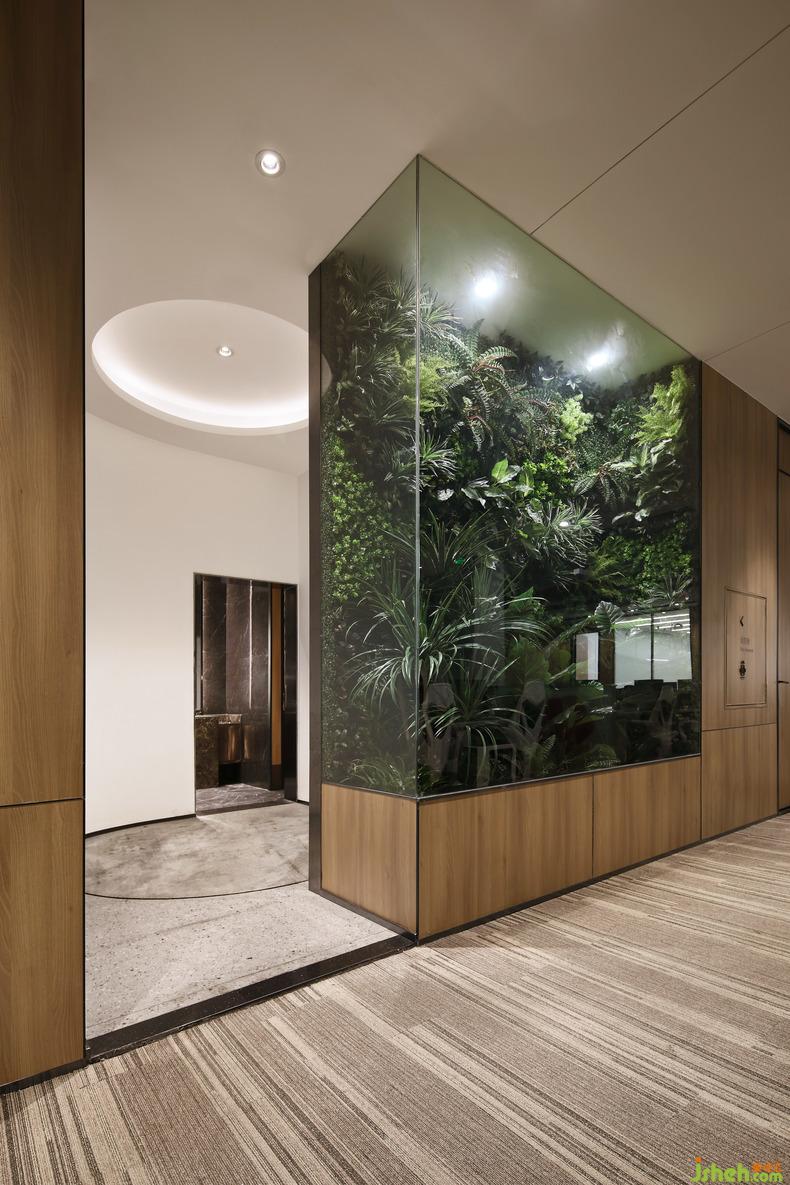 廊道一旁閃現(xiàn)的玻璃墻高聳,打破了原木墻面延續(xù)的格局,內(nèi)置的繁茂綠植令人心神安定,自然的氣息在這里被烘托得濃墨重彩