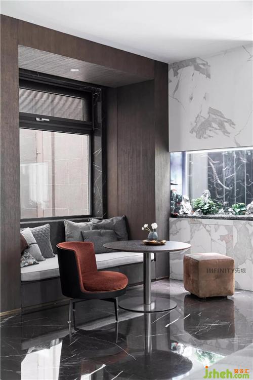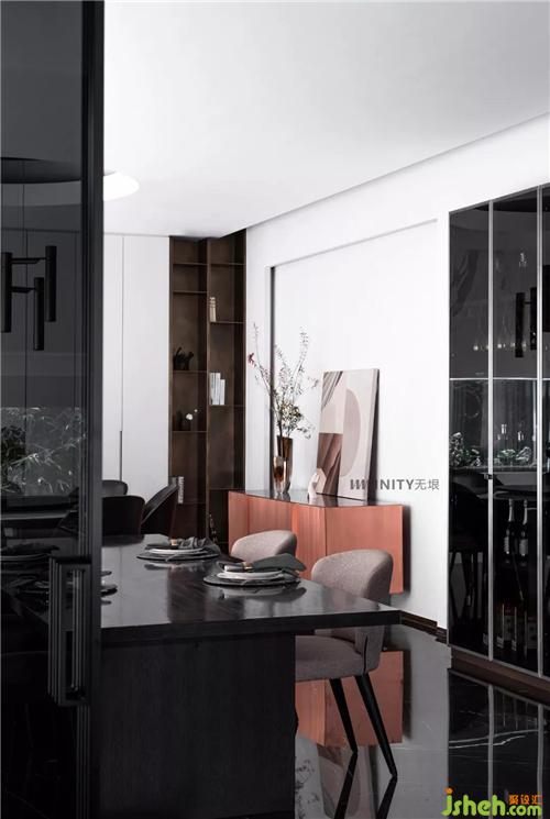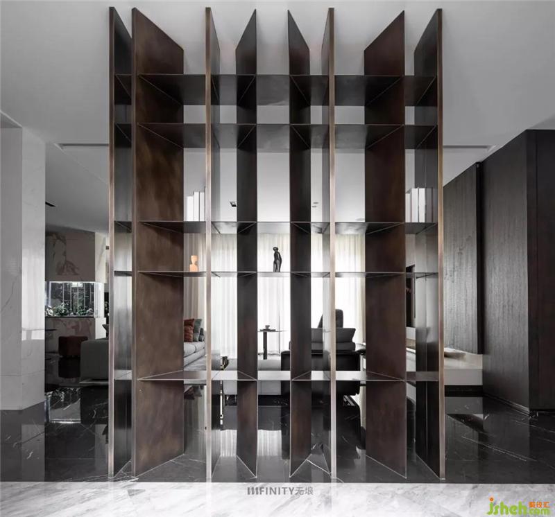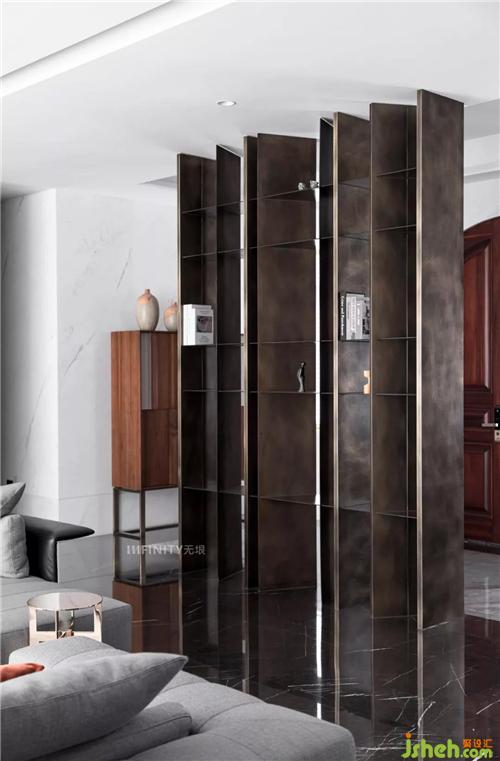 仿銅不銹鋼的屏風(fēng)柜,功能與美學(xué)并重,輕巧的區(qū)分玄關(guān)與客廳兩個(gè)空間獨(dú)立又聯(lián)系的空間層次,讓空間流動(dòng),靈動(dòng)。