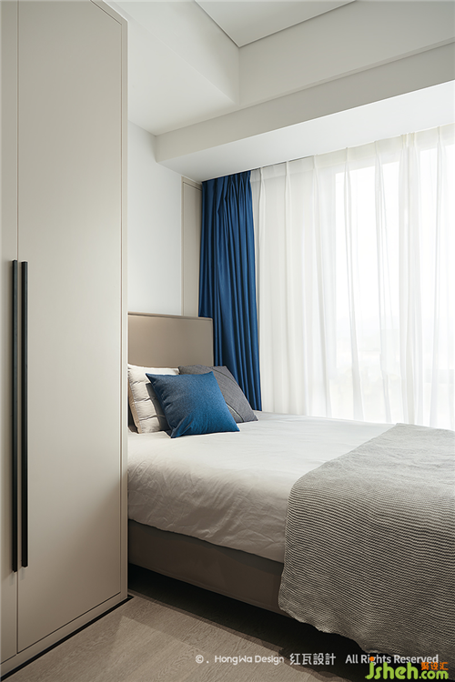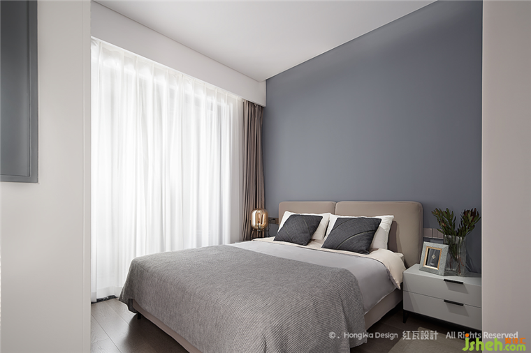 次臥給人以閑靜的感覺(jué),主色沿用了主臥的藍(lán)灰色,整面的素色背景,打造舒適、安靜的休息環(huán)境,窗簾和床頭板則采用了棕色系