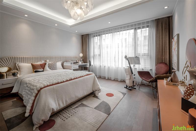 女兒房空間使用簡約內(nèi)斂的高級灰作為主色調(diào),低飽和橘色系貫穿空間,藝術(shù)品與音樂韻律的穿插,打破了空間的平淡乏味,為青春雀躍的少女時代書寫曼妙的樂章。