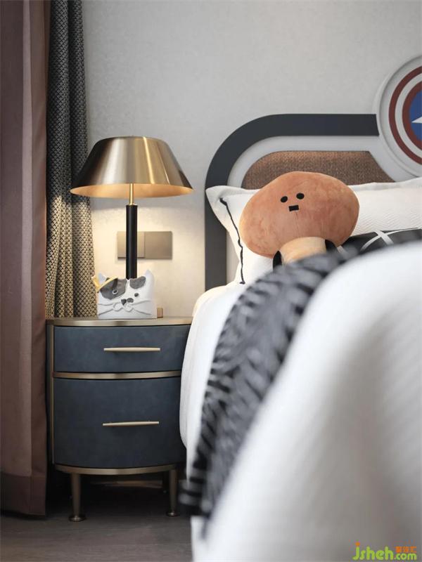 Manwei Hero主題的男孩房,樣板房設計運用紳士藍與科技白作為空間配色。圓拱造型的柜體滿足了收納與展示的雙重需求,在致敬經(jīng)典經(jīng)典與現(xiàn)代居家體驗之間完美平衡。漫威英雄的掛畫,則象征了孩童心中充滿勇氣與正義的英雄夢想。