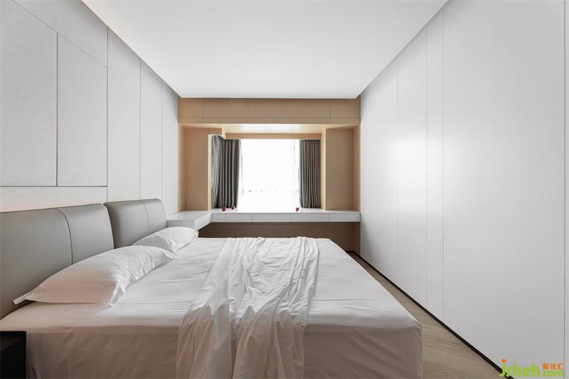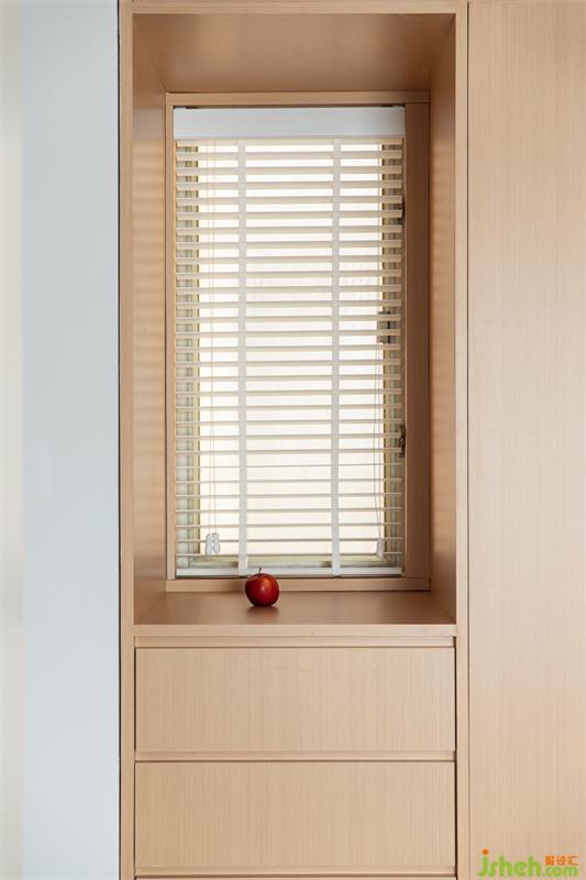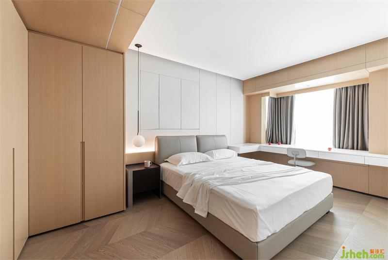 靠窗部分結合飄窗造型做成梳妝加書臺一體的桌子