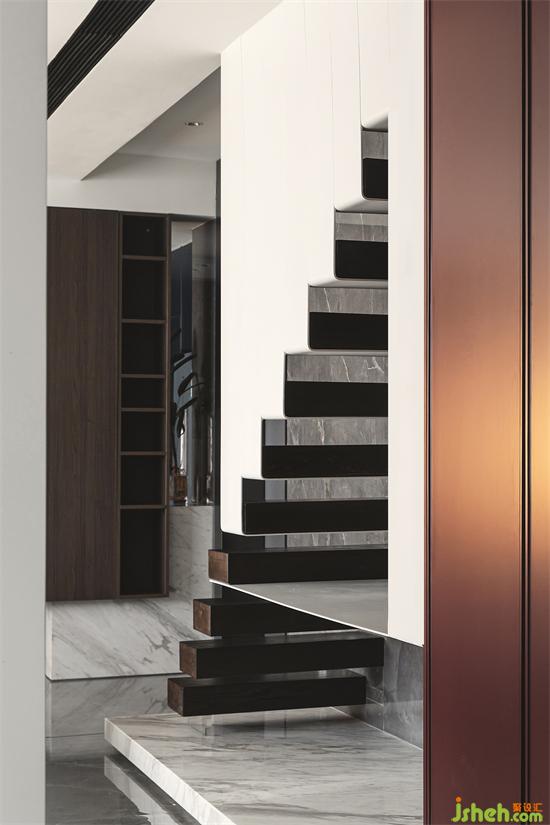 The staircase was carefully crafted as a highlight of the design. The subtle combination of wood and steel breaks the bulky feeling of the original concrete stairs. At the same time, the steel plate is used as a matching material and auxiliary pulling force in the second half, which has the richness of material vision and eliminates the possibility of the stairs being used for a long time. relaxation and deformation concerns.