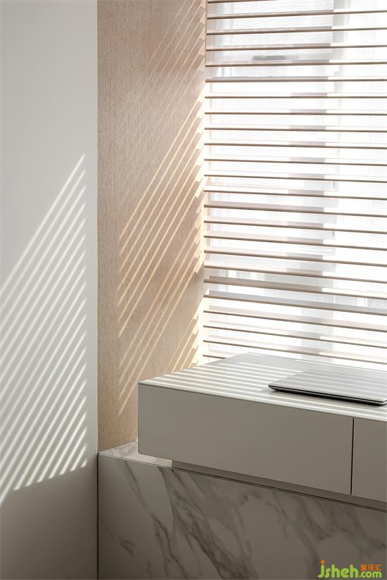 飄窗因?yàn)榻Y(jié)構(gòu)的限制,實(shí)際的利用效果往往并不理想。家裝設(shè)計(jì)主臥飄窗的區(qū)域我們定義為梳妝或收納區(qū),通過造型的疊加與穿插產(chǎn)生結(jié)構(gòu)力量感, 也提高了功能的使用率,激活空間價(jià)值。
