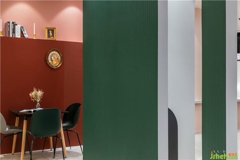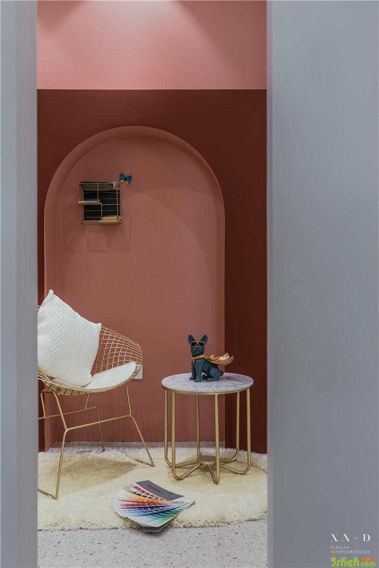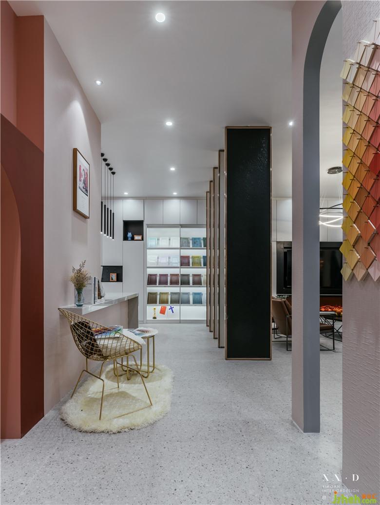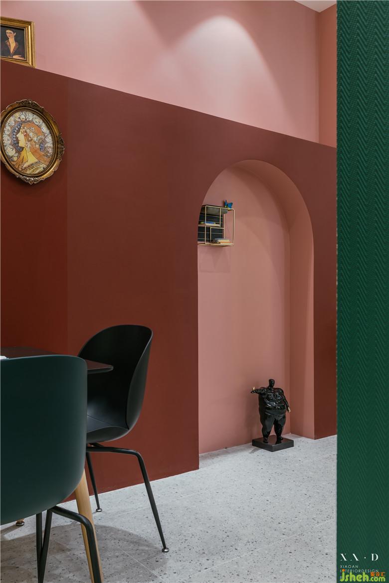 過道背景墻設(shè)計多層次空間,拱門洞的造型設(shè)計,很好的和對面的拱門隔斷相互融合,不單調(diào)的同時把顏色做區(qū)分,收口面也很好的得到解決。