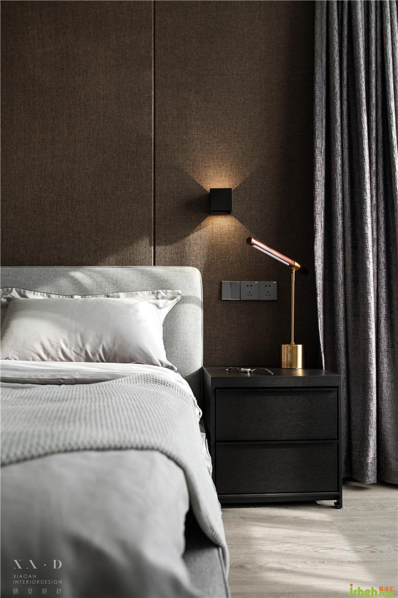 主臥的床頭背景選擇硬包材質(zhì),讓空間顯得更有質(zhì)感,床頭兩邊的暖系壁燈,主人在床頭可以打開旁側(cè)的壁燈進(jìn)行閱讀。