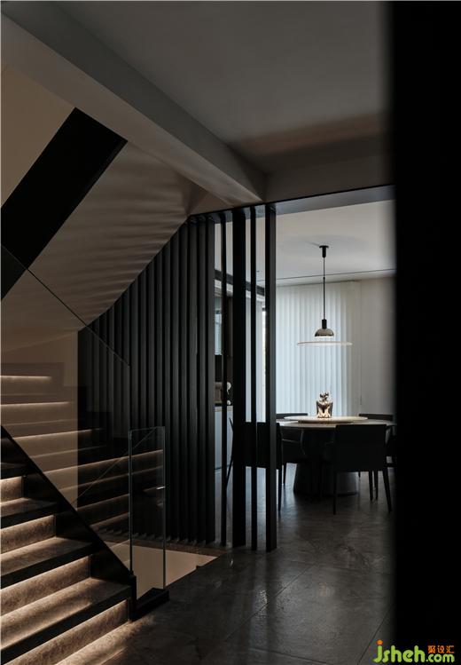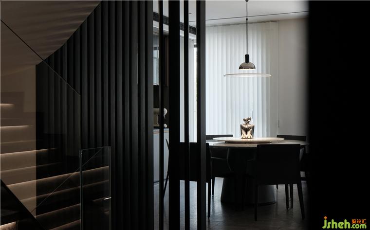 重構(gòu)不同空間的關(guān)系,滿足生活的儀式感,設(shè)計(jì)格柵型隔斷,過(guò)渡階梯并呼應(yīng)垂簾,鹽城私宅裝修設(shè)計(jì)以一種半私密的合圍方式區(qū)分空間的功能,同時(shí)延續(xù)家人之間的互動(dòng)需求。鋪墊啞光質(zhì)感,襯托簡(jiǎn)奢風(fēng)尚。