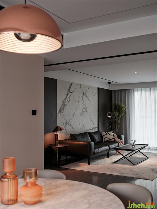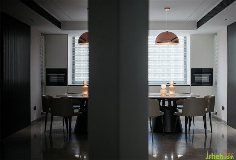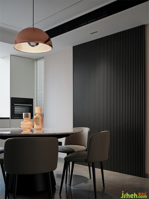 餐桌高度協(xié)同西廚操作臺,預(yù)留出開闊的窗景視野,純白基調(diào)之外增添黑調(diào)格柵飾面,既是穩(wěn)定空間體感的媒介,又是簡約藝術(shù)的表達,四周同色系的元素,卻形態(tài)各異,大平層裝修設(shè)計詮釋了大道至簡的美。