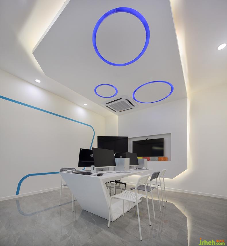 辦公區(qū)的布置十分簡潔利落:潔白的天花頂布上藍(lán)色圓形燈管,白色平行四邊形的書桌上擺著黑屏白底電腦,灰色和白色的椅子相互穿插……一切都剛剛好。