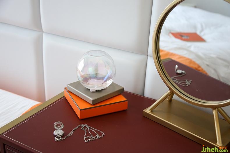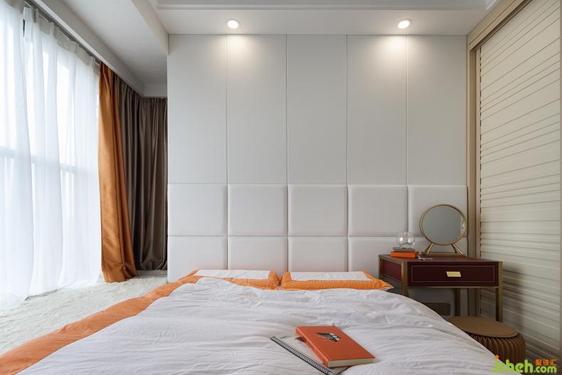 主臥以橙色+白色的床品,搭配同色系窗簾,營(yíng)造出整體清爽、輕松的感覺。飄窗偶有陽光串門,可以一邊慵懶散躺,一邊享受日光浴。