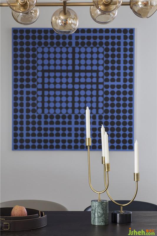 客餐廳采用一體化設(shè)計(jì),沒(méi)有設(shè)置隔斷,減少了空間的壓抑感和擁擠感,視覺(jué)上也更加通透。餐桌周邊的掛畫特意選擇了跳脫的藍(lán)色,豐富了空間層次感。