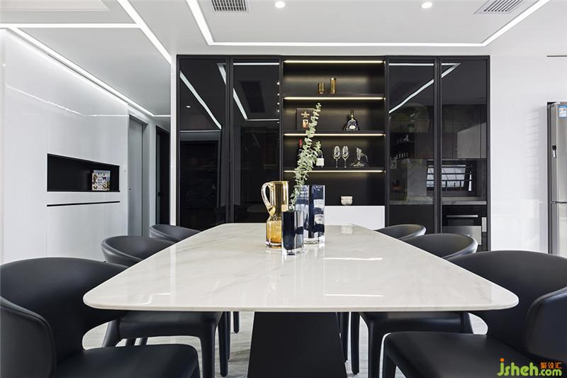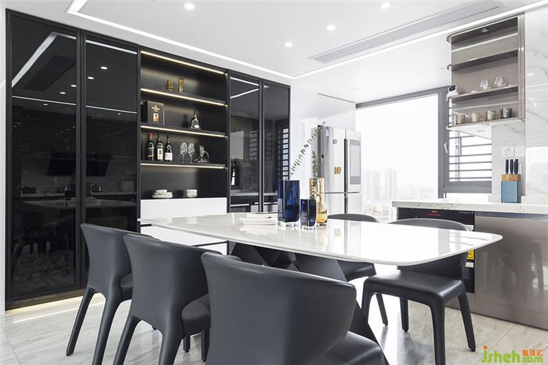 設(shè)計(jì)之美,在于空間布局、元素提煉、色彩平衡和生活態(tài)度的交融。就像客餐廚區(qū)域,三室連通,空間寬敞明亮,立面采取空間延伸設(shè)計(jì),白色烤漆和黑色玻璃材質(zhì)搭配燈光完美融合,既是墻面裝飾又是儲(chǔ)物柜,出乎預(yù)料的簡(jiǎn)單、時(shí)尚。