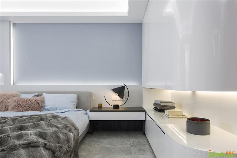 延續(xù)空間、色彩、材質(zhì)搭配的設(shè)計(jì)手法,以白色烤漆面板和灰藍(lán)色墻漆的組合造型作為沙發(fā)背景墻,且在衣柜同比例處安置一條凹位,可以擴(kuò)充空間水平方向的視覺(jué)感,搭配上內(nèi)置的燈帶,整體呈現(xiàn)出浪漫、柔情的感覺(jué),使得主臥空間的層次更加豐富。