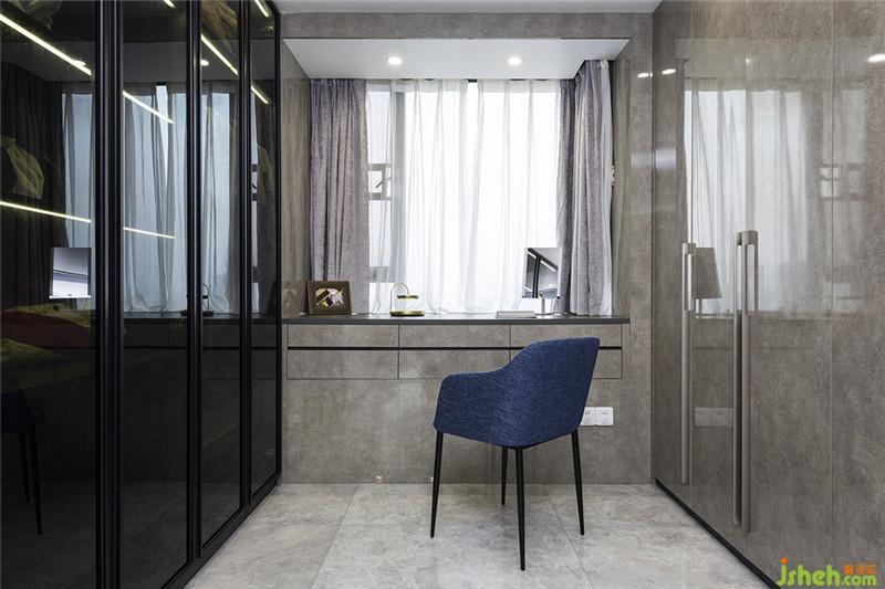 衣柜中間的飄窗部分也做了延伸處理,加高臺(tái)面設(shè)計(jì)成儲(chǔ)物柜,作為女主人的梳妝臺(tái)。如此貼心的設(shè)計(jì),不難感受到驚喜和溫暖。室內(nèi)設(shè)計(jì)師