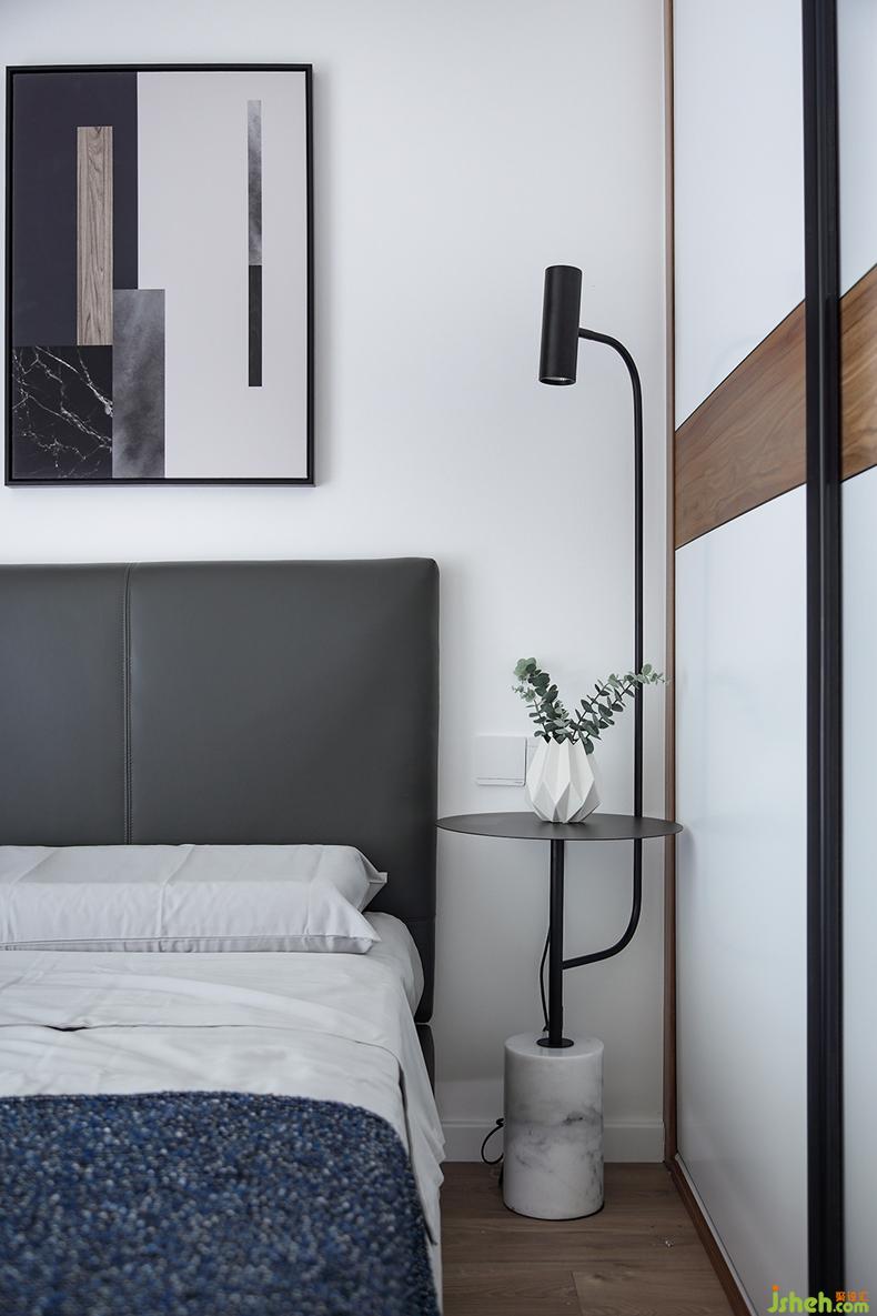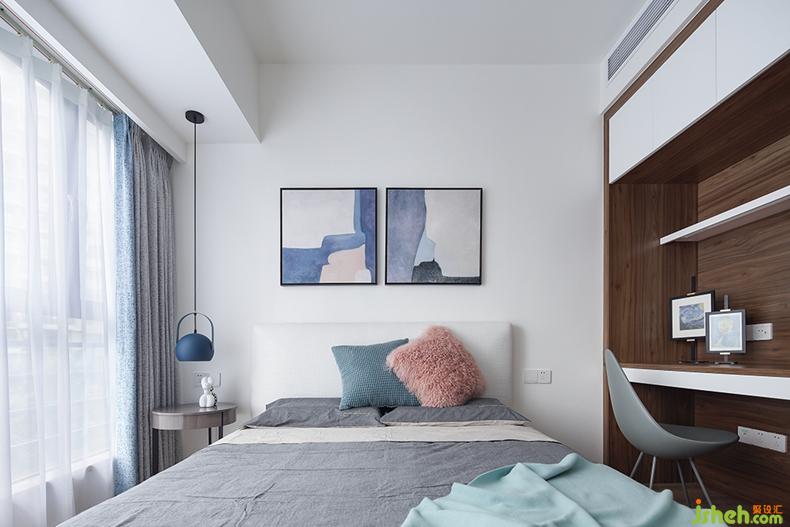 柔和的燈光,舒適的床品,只在角落隨性擺放一些小擺件,床頭掛上兩幅藝術(shù)掛畫(huà)。緊靠床邊的一體柜既可以當(dāng)作衣柜又可以作為書(shū)桌,實(shí)用中不乏小巧思。各元素之間交相呼應(yīng),空間頓時(shí)溫馨起來(lái)了。