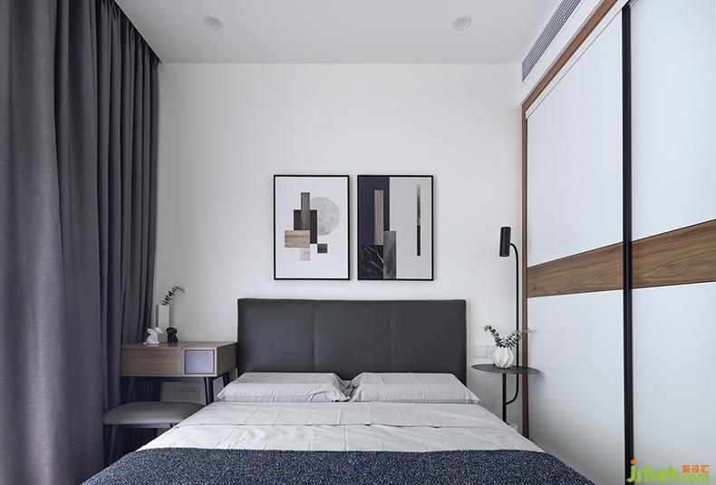 適當(dāng)留白是當(dāng)代藝術(shù)中的常用手法,主臥室便是如此,以靜謐的灰色床品搭配半高的木色護(hù)墻板,其上掛幅同色系的撞色掛畫(huà),一切點(diǎn)到為止,沒(méi)有過(guò)于繁雜的裝飾,慵懶舒適的氛圍漸漸濃厚,給人帶來(lái)無(wú)限享受。