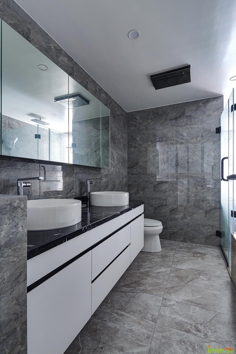 淺灰紋理瓷磚筑起了衛(wèi)浴間了的主基調(diào),黑色大理石臺(tái)面搭配烤漆柜體的雙盆洗手臺(tái),簡(jiǎn)潔素雅,呈現(xiàn)舒壓干凈的寧?kù)o之美。