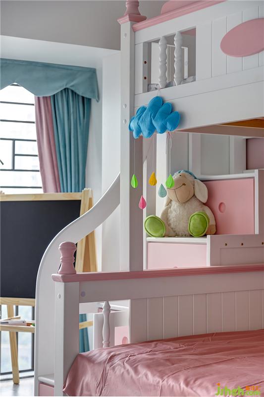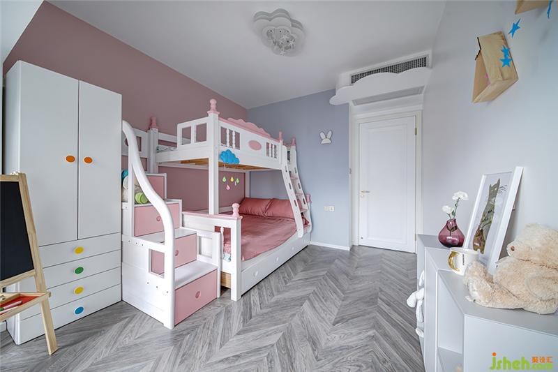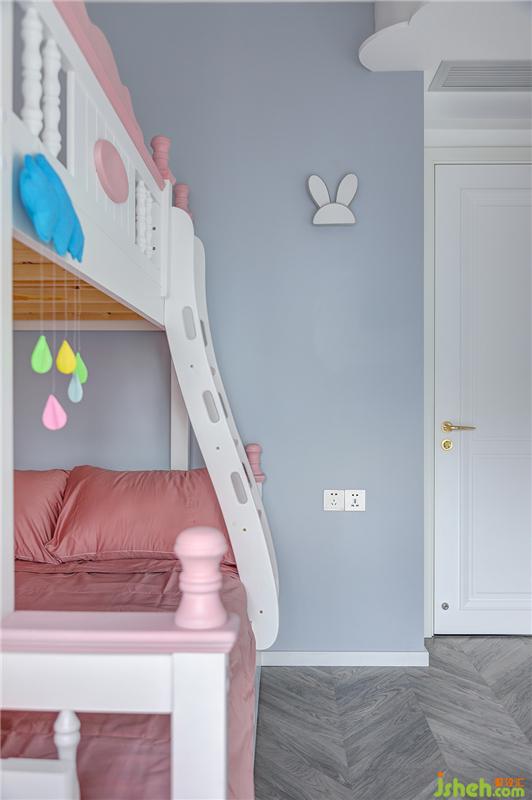 漂浮的云朵形空調(diào)擋板、軟萌的小兔子壁燈、魔法城堡樣式的上下床……在淺灰色與粉色的兒童房里,仿佛置身于夢(mèng)幻的童話世界中,甜美而浪漫。