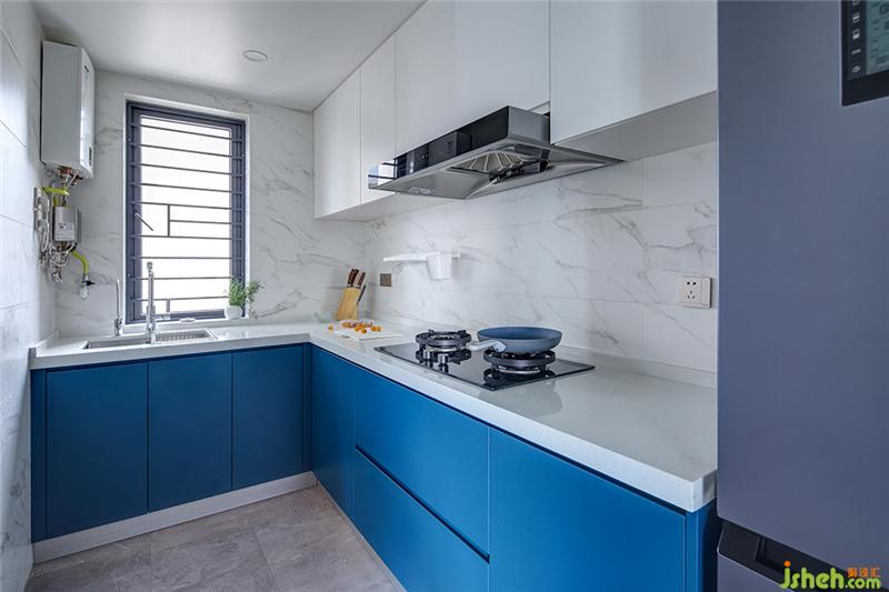 藍(lán)色,無(wú)論是天空藍(lán)、海水藍(lán)、寶石藍(lán)還是孔雀藍(lán),都代表著一種潔凈美好。如果廚房也用上一抹藍(lán)色,想必也只能沉迷做飯不可自拔了!藍(lán)白色櫥柜搭配石英石臺(tái)面,結(jié)合紋理瓷磚和灰色地磚,顏色明亮而不繁雜,更凸顯清新雅致。