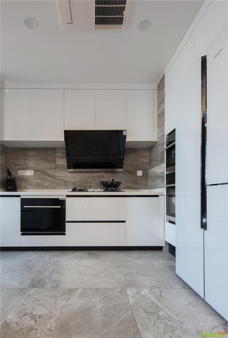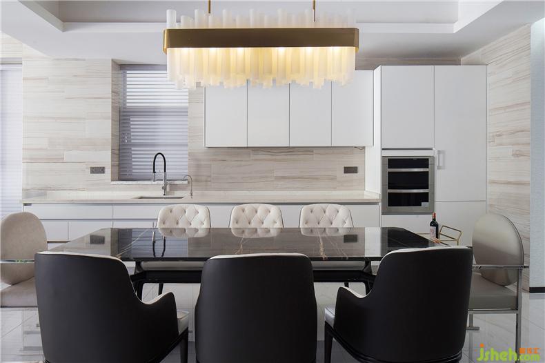 餐廚區(qū)域結(jié)合業(yè)主的用餐習(xí)慣和使用形式,別墅裝飾將中廚、西廚、餐廳三合一,組建成一個(gè)具有社交功能的開放式區(qū)域。
