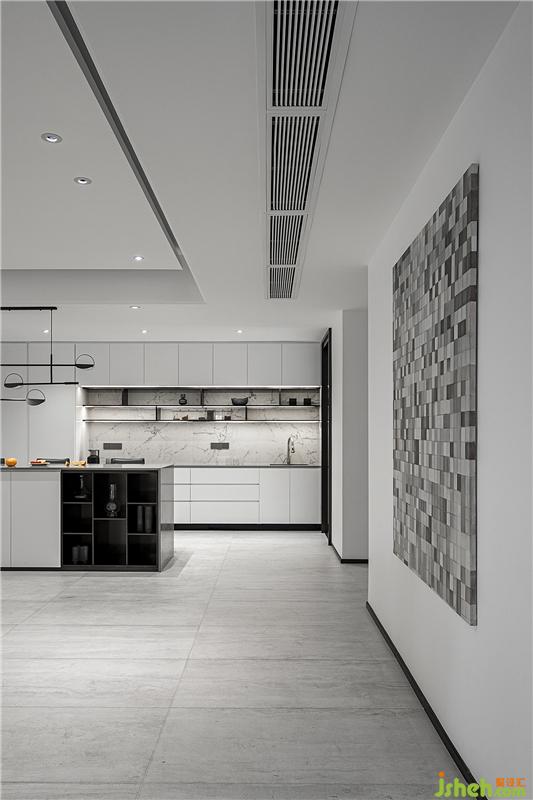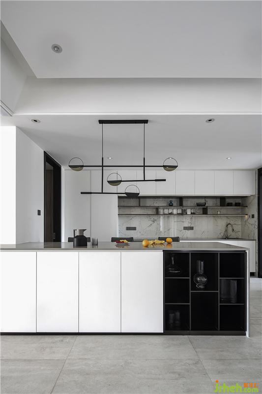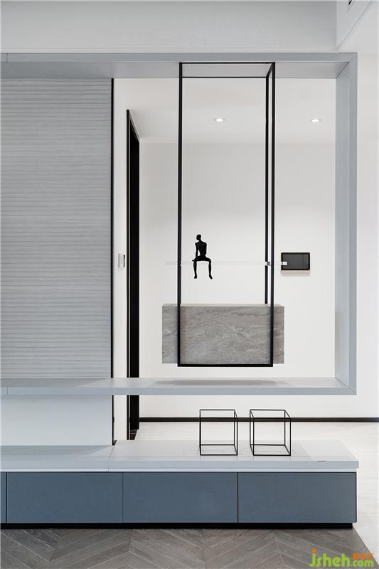 黑色鋼條與大理石、烤漆板和瓷磚之間的體塊穿插和組合讓空間更有趣味,同時(shí)也便于業(yè)主及時(shí)看到入戶情況,而從外往里看則會覺得內(nèi)有乾坤,空間更有延伸感。