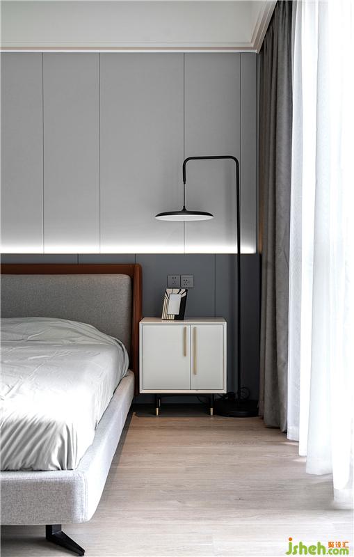 臥室主色調(diào)與公共區(qū)域的黑白灰相對應(yīng),赭石色的床頭造型并入灰度遞增的硬包與護(hù)墻板,搭配富有創(chuàng)意的燈具和床頭柜,細(xì)節(jié)之處表現(xiàn)出的藝術(shù)品味讓心靈得以放松和休憩。