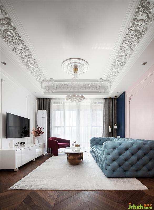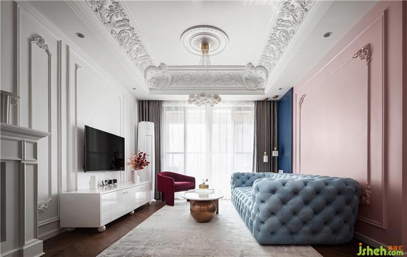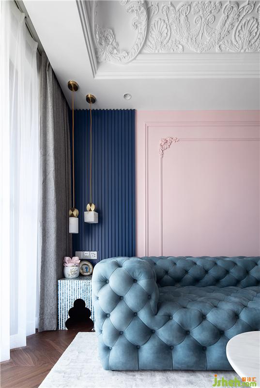 客廳家居設(shè)計(jì)大膽且富有創(chuàng)意,臟粉色和藏藍(lán)色的撞色背景墻,搭配湖水藍(lán)進(jìn)口磨砂皮沙發(fā)和酒紅色麂皮絨單椅,質(zhì)感豐富又極有新意,色彩跳躍又相得益彰。